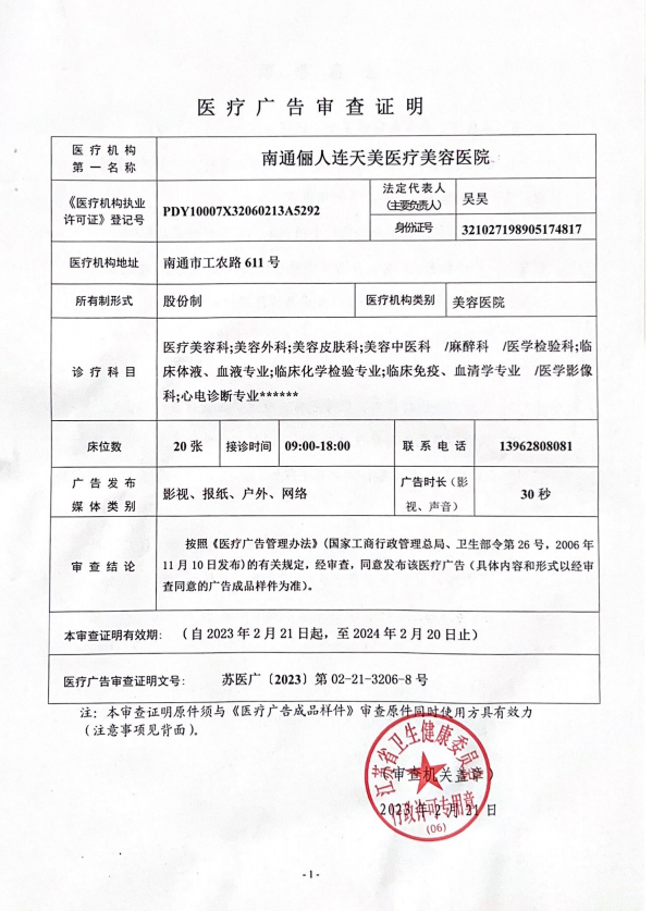 南通儷人連天美醫療美容醫院是與著名的醫療美容集團合作建立的醫院,醫院提供高品質的醫療美容服務。2008年,南通儷人連天美醫療美容醫院落戶南通,成為由南通衛生局審批的專業醫療美容醫院。南通儷人連天美醫療美容醫院,特別設有專業的整形美容科、皮膚美容科和微創美容科三大科室,致力于為廣大求美者提供全方位的醫療美容服務。南通儷人連天美醫療美容醫院為求美者建立個人終生美麗檔案,一對一進行細致服務。 11年來,南通儷人連天美醫療美容醫院,不斷引進先進設備,不斷完善醫美技術,一批優(yōu)秀、專業而穩(wěn)定的醫生團隊,為無數求美者鑄就美麗夢想。